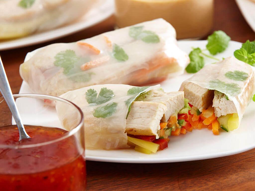 Lay the moistened rice paper on a flat surface. The wrapper should still feel somewhat stiff when you first start working with it. By the time you finish filling it, the wrapper will be soft. Place marinated vegetables, some mango, sliced avocado and 2 slices of chicken in the middle of each piece of rice paper. Top with mint and cilantro leaves. Fold the bottom of the rice paper over the chicken and vegetables, tucking in the vegetables snugly. Fold both sides in and continue rolling like a tiny burrito. Set each summer roll on a serving platter as you complete it