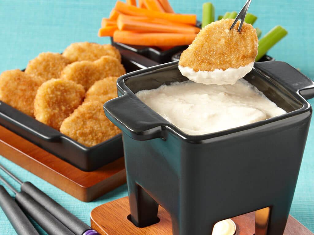 Transfer to a dip bowl and serve approximately 1/4 cup dip with 4 chicken nuggets. Serve with carrots and celery sticks, if desired.