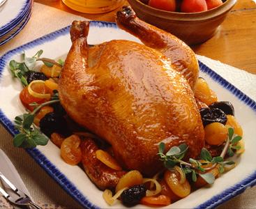 When done, meat thermometer inserted in thickest part of thigh should register 180°F. Remove from oven and serve chicken with fruit and pan juices.
