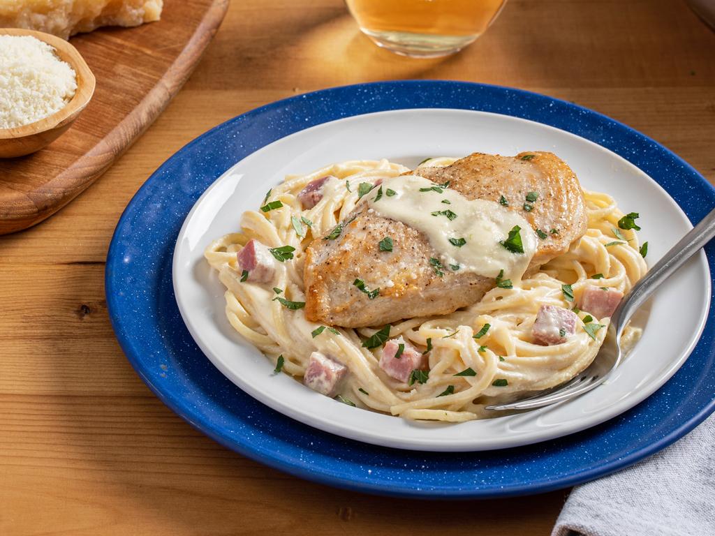 Plate the chicken over the pasta and spoon a bit of the sauce over the chicken.
