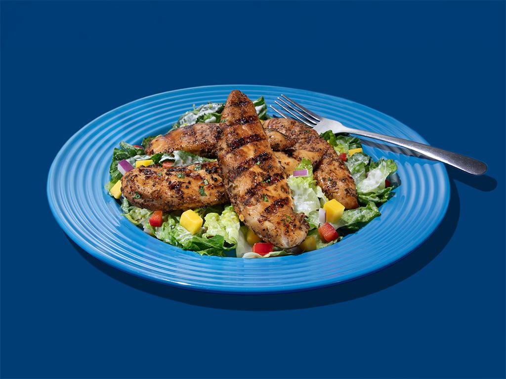To assemble, toss shredded romaine with blue cheese dressing and place on serving platter. Scatter mango, red bell pepper and red onion across lettuce. Top salad with grilled chicken slices and garnish with chopped cilantro.