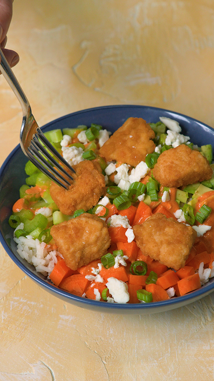 COTTAGE CHEESE BUFFALO CHICKEN BOWL Spicy buffalo flavor paired with cool, creamy cottage cheese makes this bowl hit that perfect balance.